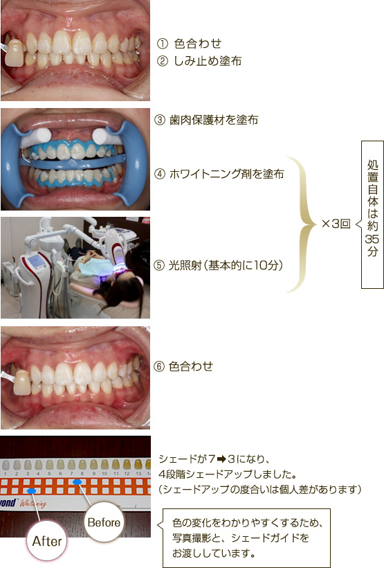 オフィスホワイトニングは、歯の中の水分を分解して作用させるため、一時的に歯が脱水状態になります。このため、しみる症状が出る方がいらっしゃいます。そのため当院では、しみ止めを使用していきます。